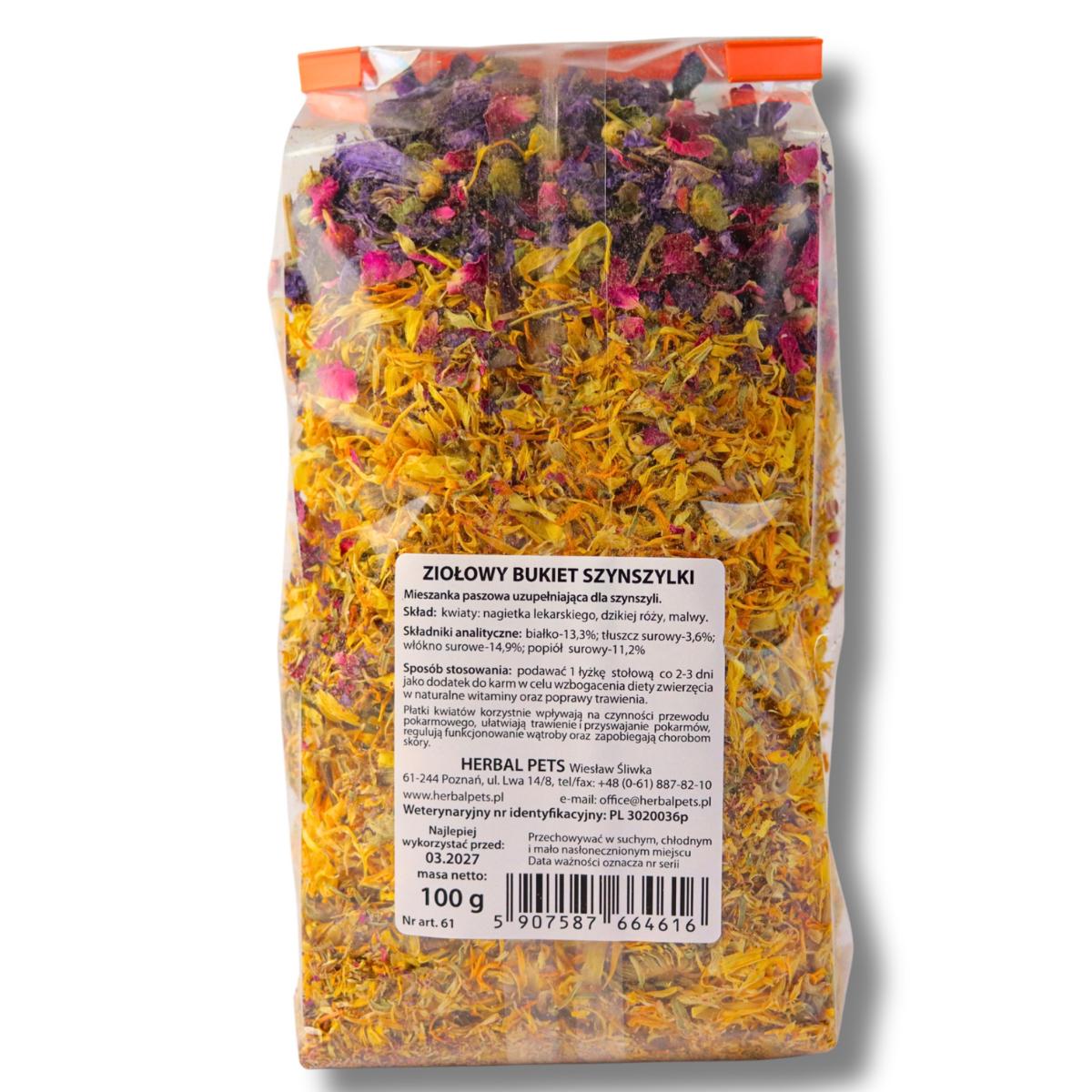 Ziołowy bukiet dla szynszyli Herbal Pets to naturalny dodatek do diety, składający się z mieszanki kwiatów nagietka, malwy i dzikiej róży. Urozmaica codzienne żywienie, a szynszyle chętnie go jedzą, dlatego warto wprowadzić go do ich diety. Mieszanka suszonych kwiatów stanowi nie tylko atrakcyjny wizualnie, ale również wartościowy element diety.