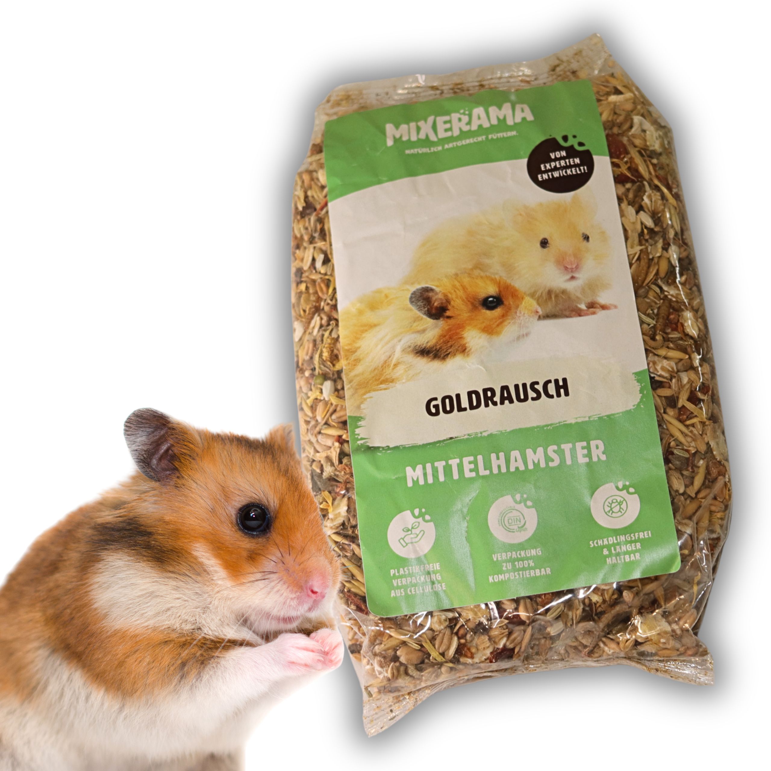Mixerama Goldrausch zawiera dodatek mączników, a dzięki temu dostarcza dla chomika niezbędny dodatek białka zwierzęcego, który w naturze, wchodzi w skład ich naturalnej diety.