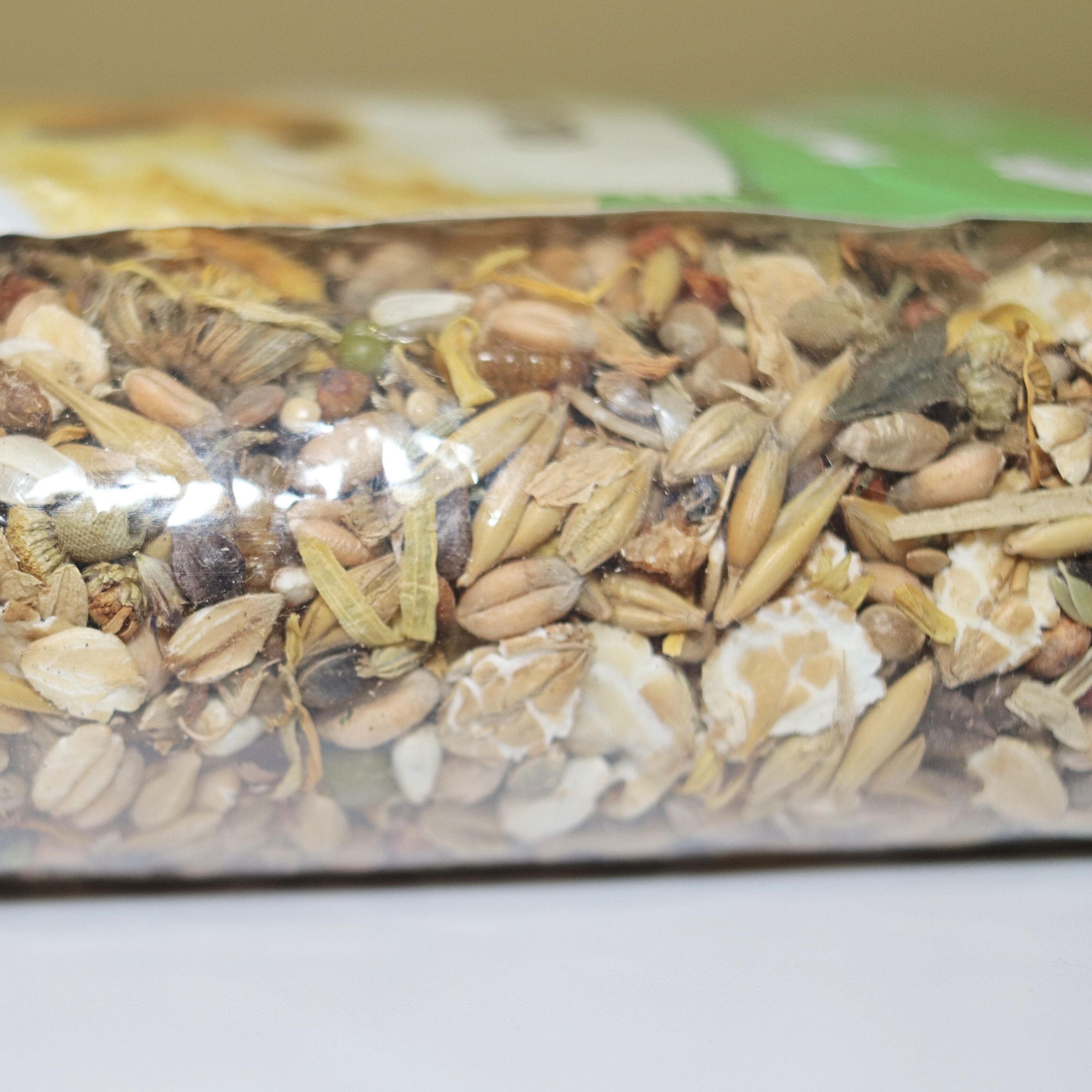 Skład: Pszenica, owies, jęczmień, kanar, proso plata, proso milo, proso srebrne, płatki owsiane, płatki jęczmienne, kasza gryczana, krokosz barwierski, ryż niełuskany, nasiona konopi, siemię lniane, fasola mung, nasiona kopru włoskiego, nasiona nigru, nasiona ostropestu plamistego, kwiaty nagietka, krewetki słodkowodne, mączniki, papryka czerwona, płatki pomidorowe, korzeń pietruszki, kwiaty rumianku, kwiaty stokrotki, kwiaty koniczyny czerwonej.