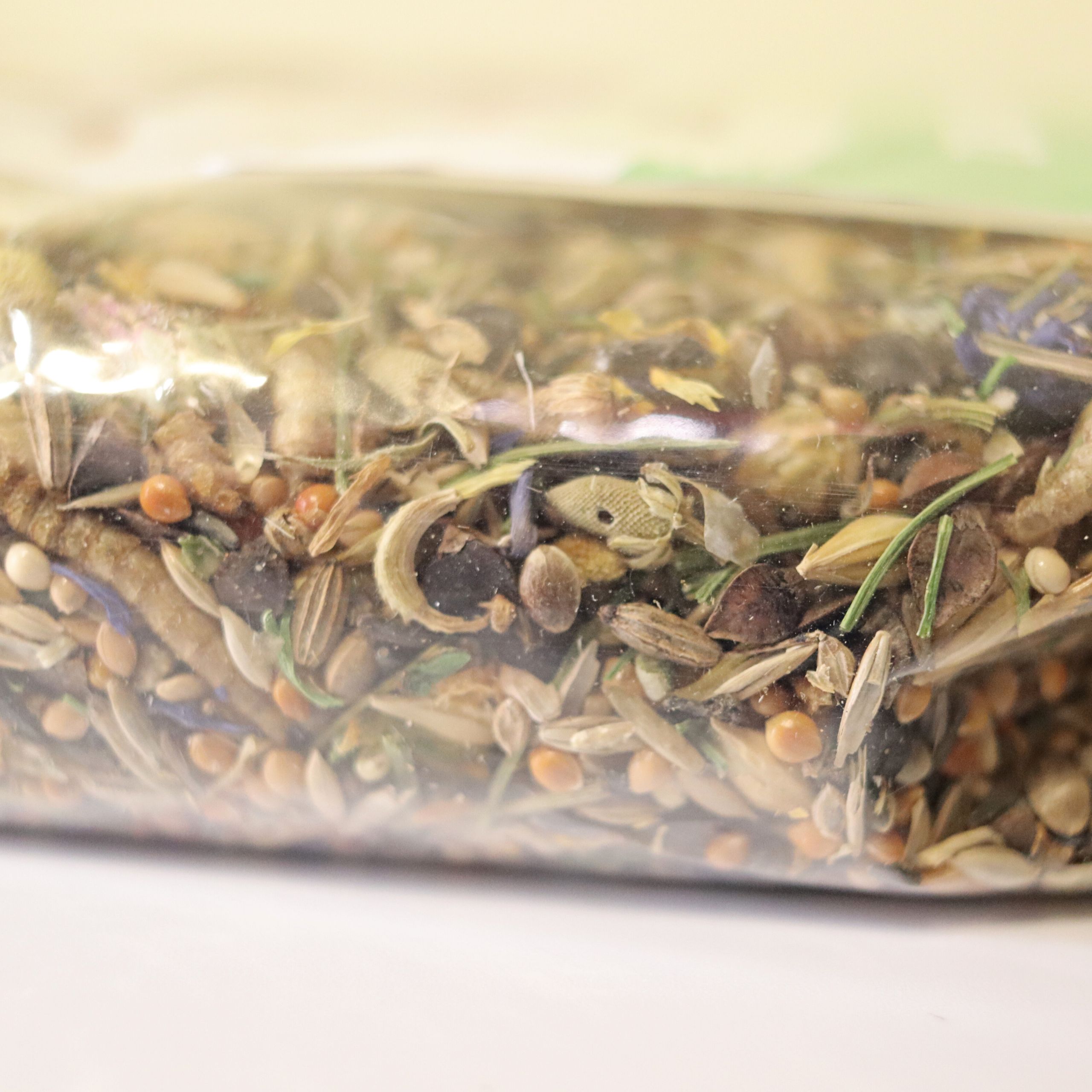 Skład: Kasza gryczana, proso zwyczajne, proso czerwone, nasiona kanaru, jęczmień, nasiona nigru, nasiona traw, krokosz barwierski, nasiona konopi, nasiona marchwi, larwy mącznika, proso japońskie, proso srebrne, proso zielone, mak lekarski, kwiaty nagietka, nasiona koniczyny, łodygi kopru, nasiona kopru włoskiego, kiełże, krewetki słodkowodne, kwiat rumianku, kwiat bławatka.