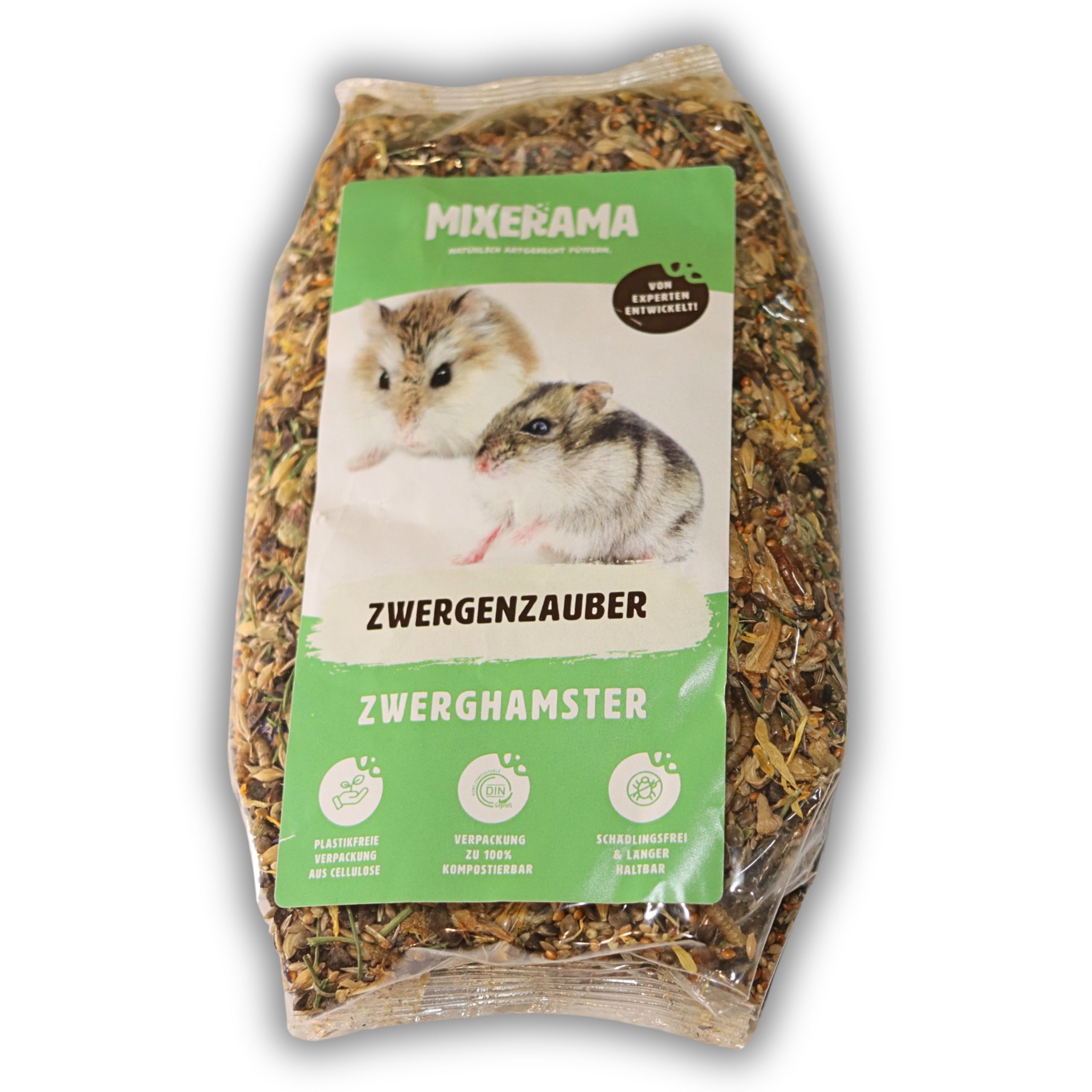 Mixerama Zwergenzauber to wysokiej jakości karma podstawowa przeznaczona dla chomików karłowatych, takich jak dżungarskie, roborowskiego, campbella oraz chińskie. Receptura została opracowana z myślą o ich naturalnych potrzebach żywieniowych i zawiera aż 23 starannie dobrane składniki.