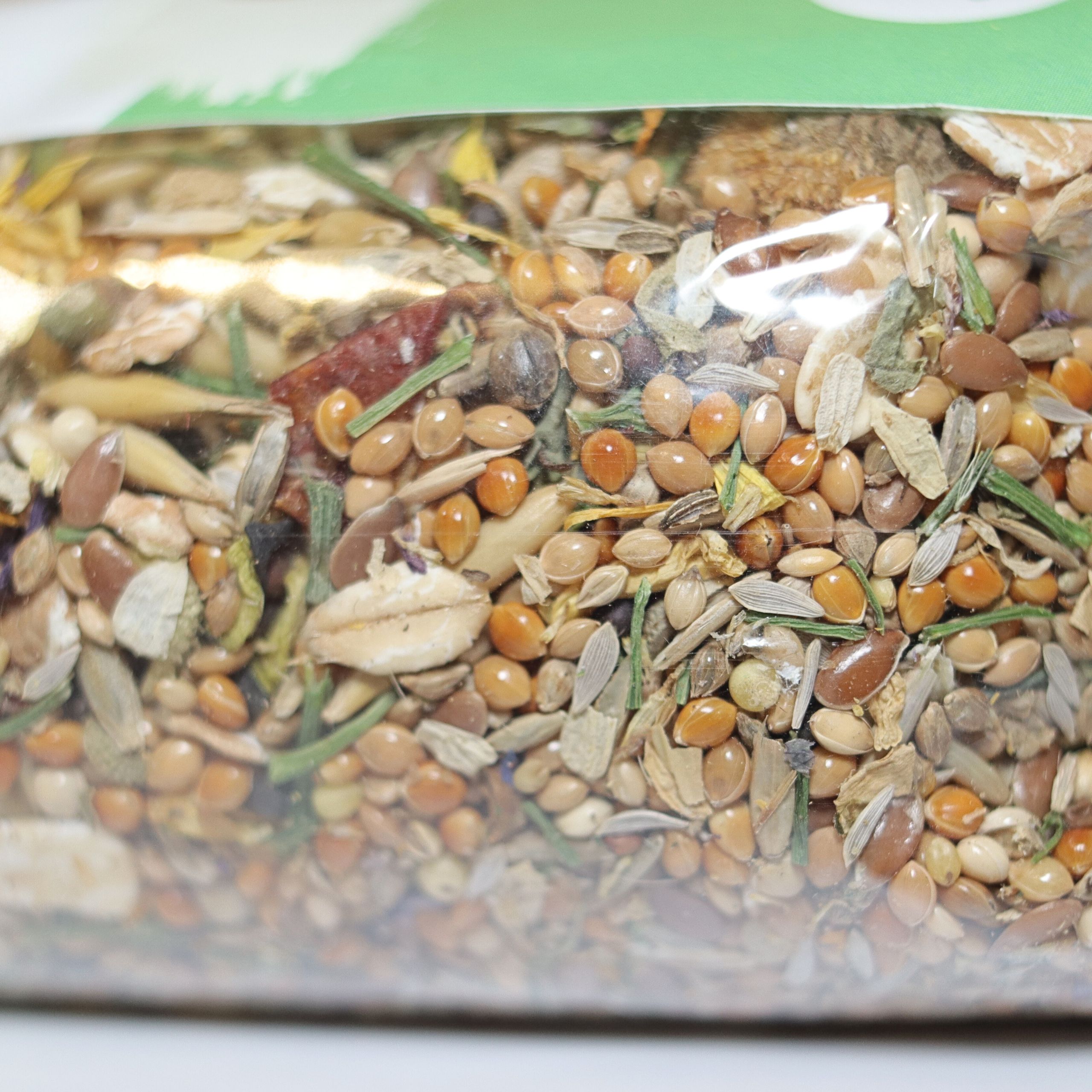 Skład: Proso żółte, proso czerwone, proso senegalskie, pszenica, żyto, jęczmień, owies, proso srebrne, proso japońskie, płatki pszenne, płatki orkiszowe, płatki jęczmienne, płatki owsiane, siemię lniane, kwiat nagietka, nasiona traw, nasiona konopi, plasterki marchwi, rumianek, łodygi kopru, nasiona roślin łąkowych, nasiona sałaty, rzepa, plasterki ogórka, kostki cukinii, kwiat malwy, czerwona papryka.