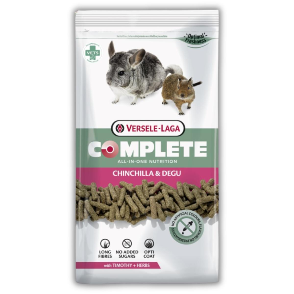 Karma dla szynszyli i koszatniczek Versele Laga Chinchilla Degu Complete. Granulat bez ziaren, bogaty we włókno, wspiera trawienie i prawidłowe ścieranie zębów.